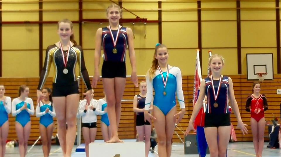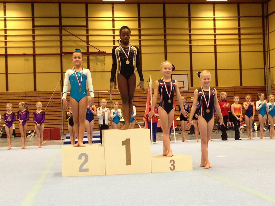 Van de bovenbouw kwamen vandaag Lisa, Gina, Maika, Claudia, Britt en Carlijn in actie. Door blessures heeft Carlijn de afgelopen anderhalf jaar constant aangepast moeten trainen. Dat was niet af te zien aan de sterke oefeningen die zij vandaag liet zien, waarmee zij uiteindelijk 9e werd. Heel knap doorgeknokt! Claudia pakte op sprong afstand van de concurrentie met een mooie Tsukahara en turnde een strakke vloeroefening. Op balk ging het 2 keer mis, maar toch mocht zij de medaille voor de 3e prijs in ontvangst nemen. Gefeliciteerd! We zijn ook trots op Lisa, Gina, Maika en Britt, die veel vooruitgang boeken in moeilijkheid en uitvoering.